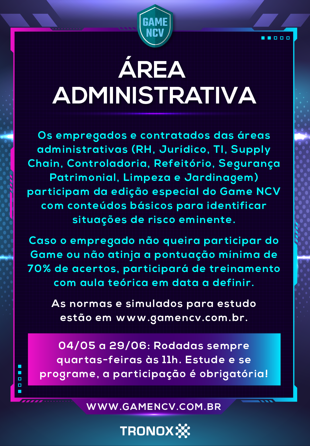 Game NCV Área Administrativa 11/04/2022 O Game NCV Área Administrativa vai acontecer de 04/05 a 29/06, com rodadas sempre às quartas-feiras às 11h. Estude e se programe, a participação é obrigatória!